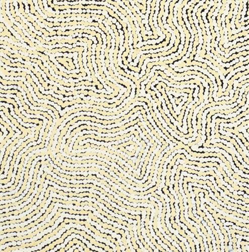 This painting represents the rocky outcrop and all the different areas of claypans, and the dark area represents all the jurnga (sands) in the cool time, warri (translation needed). All the light yellowish colour represents the paru (spinifex).