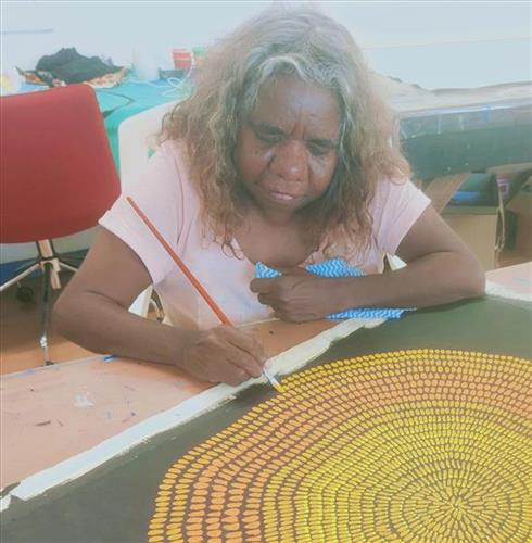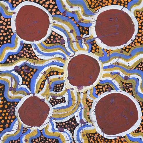 This artwork showcases the artist’s skillful use of colour, texture, and technique, reflecting a deep connection to their environment and culture. Each detail embodies the unique identity of Bidyadanga Artists, where the original five language groups—Nyangumarta, Mangala, Yulparija, Juwaliny, and Karrajarri—come together to create art that speaks to the heart of Country. Over time, the community and Art Centre has grown to include people from other Kimberley tribes, fostering a space where diverse cultural knowledge and practices come together. Situated where the desert meets the sea, artists draw inspiration from their ancestral Country and personal journeys. The artist captures the vibrant beauty of both desert and coastal landscapes, blending earthy reds, deep blues, and intricate patterns distinctive to their cultural heritage. The themes and composition invite viewers into the artist’s world, offering a glimpse of the rich, intertwined histories and the enduring connection to land and spirit that define the Bidyadanga community.