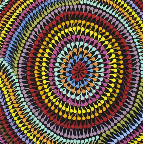 Now living in Bidyadanga with her Karajarri husband and family, Christine paints her black soil Country and the plants and animals that bring new life. She is passing her “seeds style” on to her daughters and children.