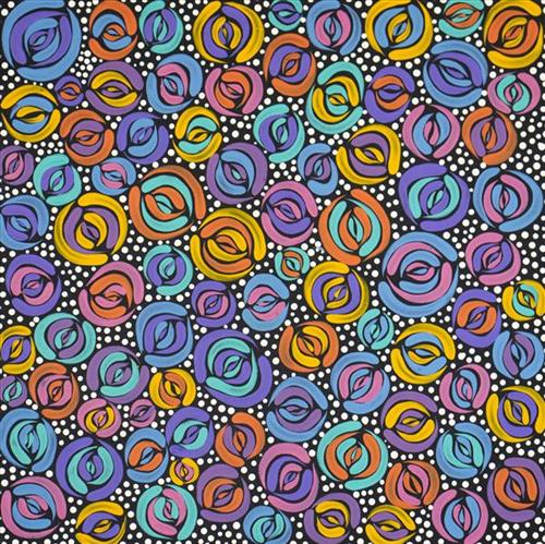 Le’Laine is a Karajarri/Ngowmi woman who grew up in Bidyadanga Community. She comes from a family talented in both art and music. She is inspired by both her mother’s Country and her father’s Country. Le’Laine paints alongside her mother, who shares stories of her Country, Ngarrawanyi, in the East Kimberley region.