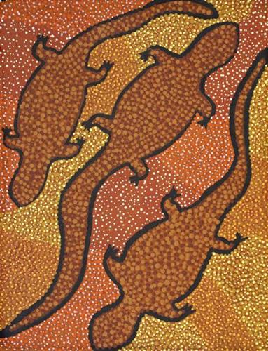 This painting is about the landscape, bushfire (waru), and bush foods. Seeing the difference after the waru burns, it leaves some patches on the ground, and when the regrowth of the bush plants come back to life, it leaves a mark.