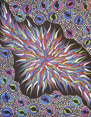 Le’Laine is a Karajarri/Ngowmi woman who grew up in Bidyadanga Community. She comes from a family talented in both art and music. She is inspired by both her mother’s Country and her father’s Country. Le’Laine paints alongside her mother, who shares stories of her Country, Ngarrawanyi, in the East Kimberley region.