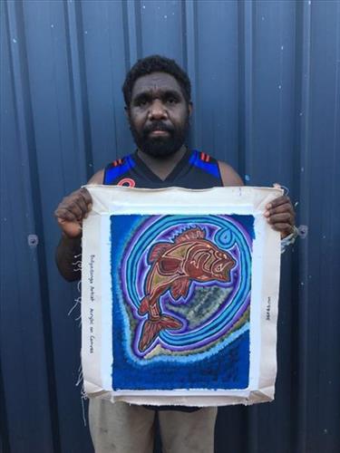 “All the fish – barramundi, salmon, dugong, turtle and jellyfish. I paint what I see and eat. Fish of the sea. I paint the right season for them, so if something is in season, I paint it. The threadfin salmon and blue nose salmon come in wintertime. Barramundi is in the hot time, when the jellyfish come out. Dugong is after the rainy season.