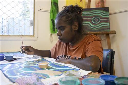 “I work at the La Grange Remote Community School. I started in March 2025. I like getting to know new teachers and helping kids. After work, I come to the Art Centre and finish my painting. I paint sea animals. I inspired myself to paint. My mum and dad used to paint here at the Art Centre a long time ago, and I used to come and watch them. My mum is Julwayli and my dad is Nyangumarta. I like to sell my paintings. I’d like to go to exhibitions and travel with my painting. Me and my mum paint the same things but in our own way.”