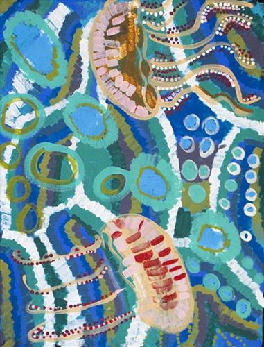 “I paint about fish, stingray and crab. I paint any kind of fish.  I use blue, green, white and purple to represent the water. We catch fish to cook up and eat. When we get fish, we also share it with families. People are happy to receive it and to eat it. One time I caught a big salmon at Japulu beach, straight down from Bidyadanga. That was the biggest fish I ever caught. I cooked it up on the fire.”