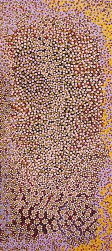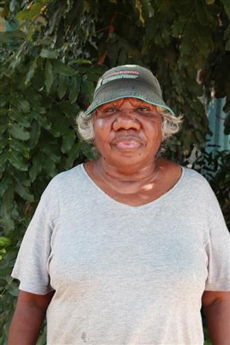 “I was born in Broome and grew up in Bidyadanga. I went to school a long, long time ago, then went to Nulungu College in Broome. After that, I went back to Bidyadanga. I have eight kids — two boys have passed away — and seven grandkids, one in Perth. I started painting the year before last, in 2020. I paint the desert, bush flowers, and the waterholes. I’ve been living in Bidyadanga for a long time. When we were schooling, we stayed in the dormitory with all the other girls. We used to have blue tops and floppy pants to go to school. We were really happy when we were young. They would take all the kids out — we used to go fishing, or out to Port Smith for dinner or a day out on the big truck. All the kids used to be hanging on the back (chuckling), camping and fishing. Nobody taught me to paint — I had to do it on my own. I saw the other girls painting and I had to join. It makes me feel good, sitting down, relaxing, and painting. I paint about my mother’s Country, Mangala. I hope to keep painting and continue at my Art Centre.”