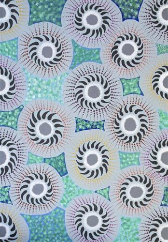 Petha is a Karajarri/Ngowmi woman who grew up in Bidyadanga Community.  She is a talented arist and musician.  She is inspired by both her mother's country and father's country.  Petha paints alongside her mother who shares stories of her country, Ngarrawanyi.