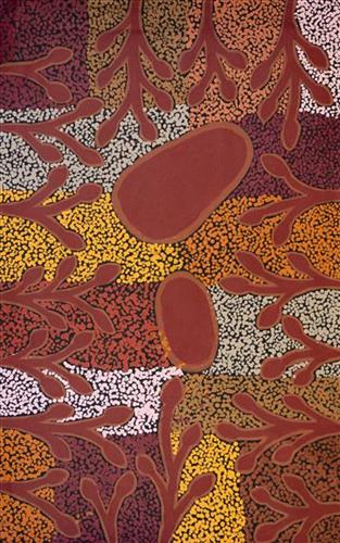 I started painting with Martumili (Martumili Artists), but before I began painting, I used to ask the old people first. I learnt to paint from my grandfather (Wokka Taylor, dec.). When we went to 33 and back to Punmu, we were just watching them. He told me to get a brush, and then he told me to start painting. I think him and Dunjan (Thelma Judson) were painting a big one, and I came to help him. He told me, ‘One day you should go to Kulyukartu,’ and so I went there.