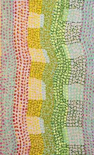 Families remember camping there, visiting waterholes, looking for goanna and bush foods, watching birds, and travelling with old people who knew every dune, track and soak. The painting celebrates the beauty and calm of Kulyakartu, often shown through soft lines and dots that follow the movement of water and sand. It honours the knowledge of where to find water, how to move across Country, and the deep belonging felt when returning to ancestral places.