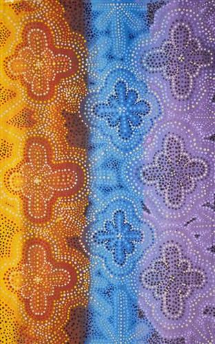 Through colour, pattern, and rhythm, the artist captures the cycle of seasons and the knowledge passed down — knowing when to gather certain foods, when animals are fat, when storms are coming, and how to care for Country through fire and everyday living. The work celebrates the constant relationship between people, weather, land, and sea, honouring the strength and continuity of cultural life.