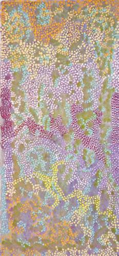 Families remember camping there, visiting waterholes, looking for goanna and bush foods, watching birds, and travelling with old people who knew every dune, track and soak. The painting celebrates the beauty and calm of Kulyakartu, often shown through soft lines and dots that follow the movement of water and sand. It honours the knowledge of where to find water, how to move across Country, and the deep belonging felt when returning to ancestral places.