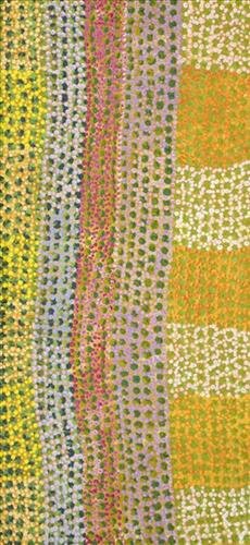 Families remember camping there, visiting waterholes, looking for goanna and bush foods, watching birds, and travelling with old people who knew every dune, track and soak. The painting celebrates the beauty and calm of Kulyakartu, often shown through soft lines and dots that follow the movement of water and sand. It honours the knowledge of where to find water, how to move across Country, and the deep belonging felt when returning to ancestral places.