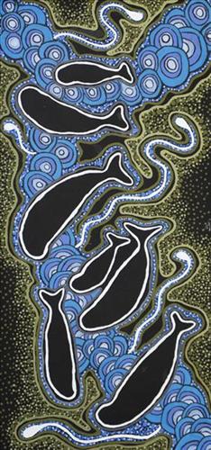 This artwork invites the viewer into the world of salt-water Country — the sea animals, the tides, the reefs, the mangroves, the hunting, the gathering, and the guardianship of coast and sea. The artist portrays fish, turtles, rays, dolphins, dugongs, sharks, crustaceans and shellfish, weaving together the patterns of sea-grass, coral, tidal flats, beach and reef.