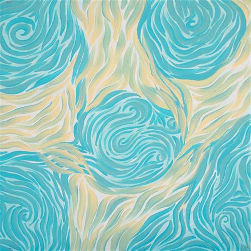 “Bardi people learn to live off the land and the sea. We use certain plants to indicate which animals are good for eating. For example, the wattle flower tells us the mullet are good to eat; their fat and their eggs are best when the wattle is flowering. We need to know which plants create spears and which roots paralyse the fish so we can catch them. We use the land to help us hunt the sea. My paintings are all about how we use the land to hunt the sea. All the colours I use have meaning.”