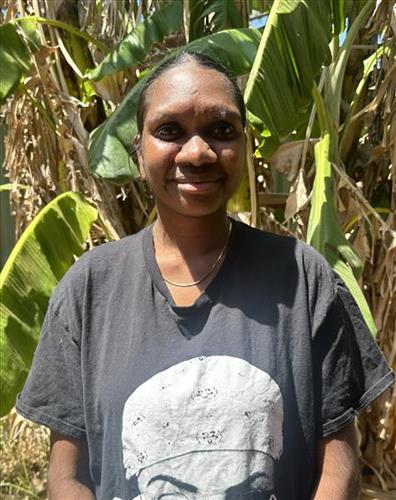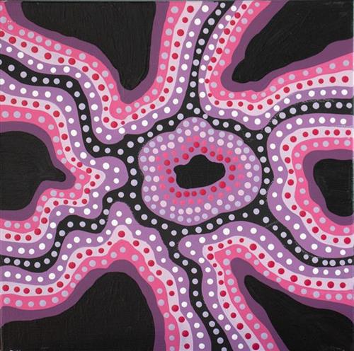 “The story behind this painting is from when I worked with the Nyangumarta Rangers going out on Country. You look at the landscapes and see the beautiful colours. The green represents the trees and native plants, and the red and orange represent the colours of the sand dunes and the land. You feel peace and at home when on Country.”