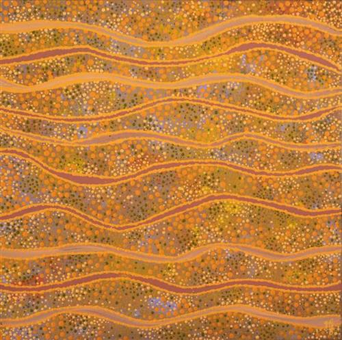 Patterns trace tracks of animals and people; dots and lines follow water after rain; maps, camps, soaks and sandhills. The work also reflects the way caring for Country continues today — through ranger work and community leadership that bring together cultural knowledge and science to look after land and water.