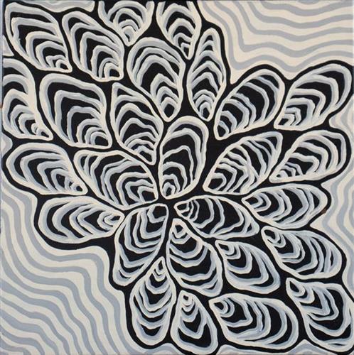 Jaymee-Lee’s paintings are deeply rooted in Bardi culture, storytelling, and the connection between land and sea. Each artwork reflects knowledge passed down by Elders, showing how Bardi people use Country to guide hunting and fishing practices. Her works feature culturally significant animals and bushfoods — moonga (sugar bag), goordaarlga (white currant), goodoo (mud clam), ambarn (manta ray), big mullet (loongoorl, baitfish), jooloo (Spanish flag), budumbud (blue bone), and stingray — representing survival, hunting, and seasonal knowledge. The colour choices carry meaning: black represents the strength of rocks and sea shadows, while gold reflects sunlight on the water. Pink and earthy tones mirror fish flesh, sand, and tidal pool reflections.