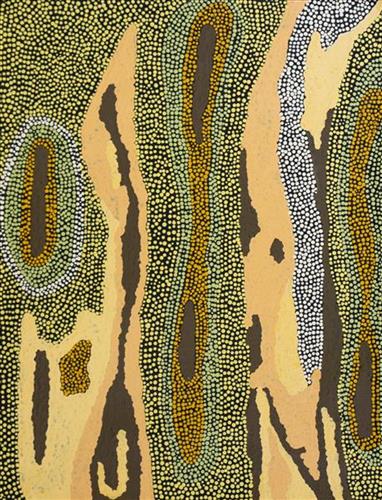 “This is a painting about bush medicine. It’s been boiled up. You boil it up and it turns into a burgundy sort of colour. Smells like eucalyptus. It is used for sores, rash, any skin condition. It’s a white gum tree.”