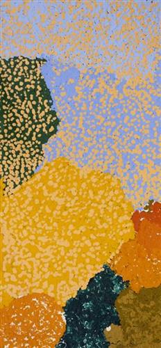 This painting shows the artist’s Country in the Percival Lakes region. Yikartu’s daughter, Bali Bumba, was born in this area when they lived a traditional pujiman (desert-born) life. The painting includes lyinji (claypan), jurnu (waterhole), kurru (river), and a big warla (lake).