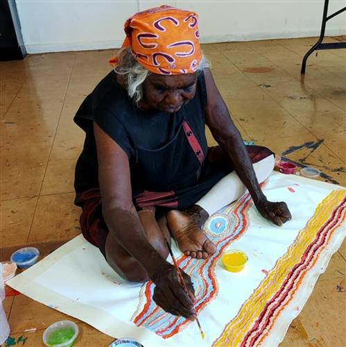 In painting, the desert becomes a map of belonging — circles showing water and camps, lines following walking tracks and dunes, and soft patterns recalling plants, sand ridges and the glow of sunsets across wide skies. Colours shift between deep reds, ochres, warm sand tones and the greens that come after rain.