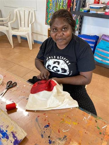 Artists draw on stories of place, family, movement, and survival — caring for both land and sea, hunting and fishing, and living between two immense environments. Patterns, marks, and flowing forms echo desert dunes, waterholes, tidal flats, reefs, bushfoods, and sea life, honouring the knowledge held across generations.