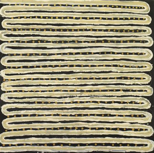 This artwork reflects the artist’s connection to Bidyadanga, a place where the desert meets the sea. Through colour, pattern, and texture, the painting captures important themes that shape the identity of the community and Art Centre.