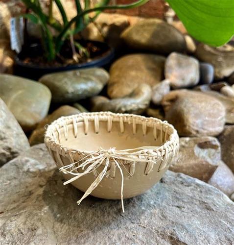 This little bowl holds quiet traces of country- soft Symbols painted and weaving stitched with care. A gentle blend of earth and hands, carrying story in a subtle way