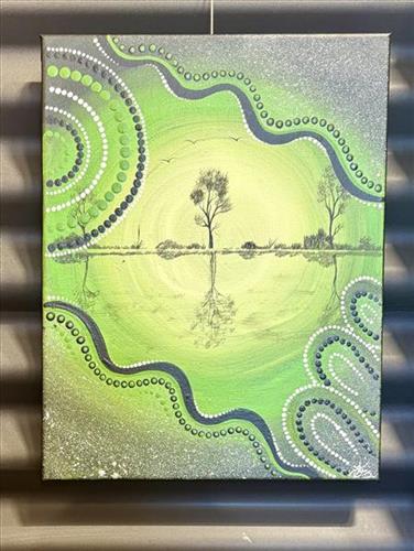 I was born in Mildura Victoria, and raised on a mission on Barkindji Country. I spent a lot of time with my Aunty Sharon, who taught me to paint and learn about symbols. I learnt my culture through my mob and my Elders.
